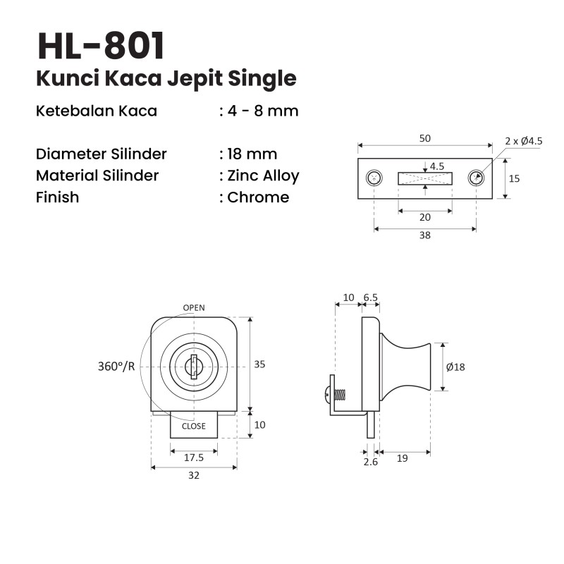 Kunci Kaca Jepit Single HL-801